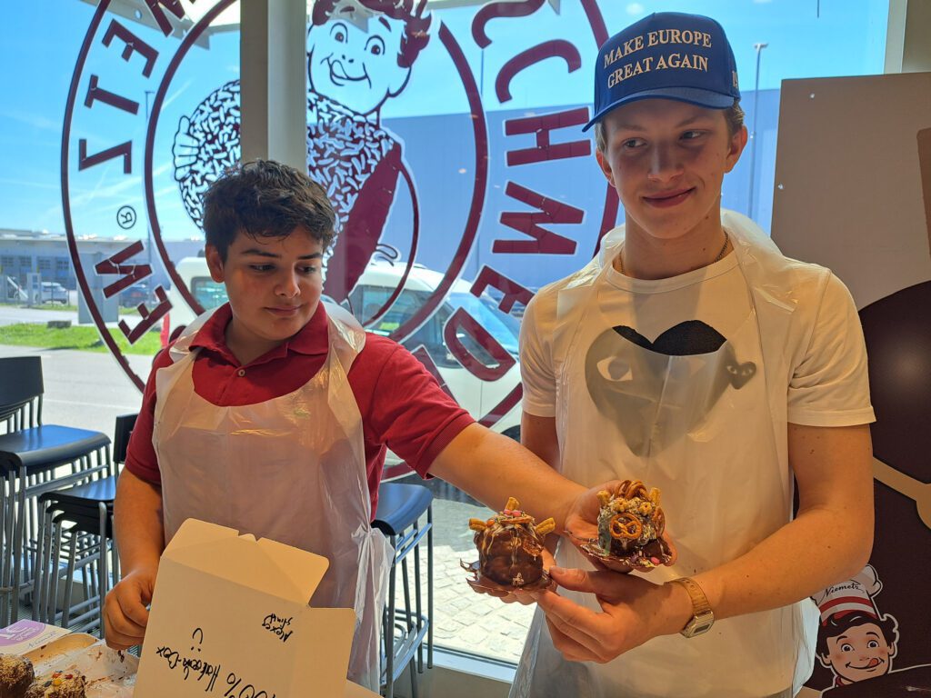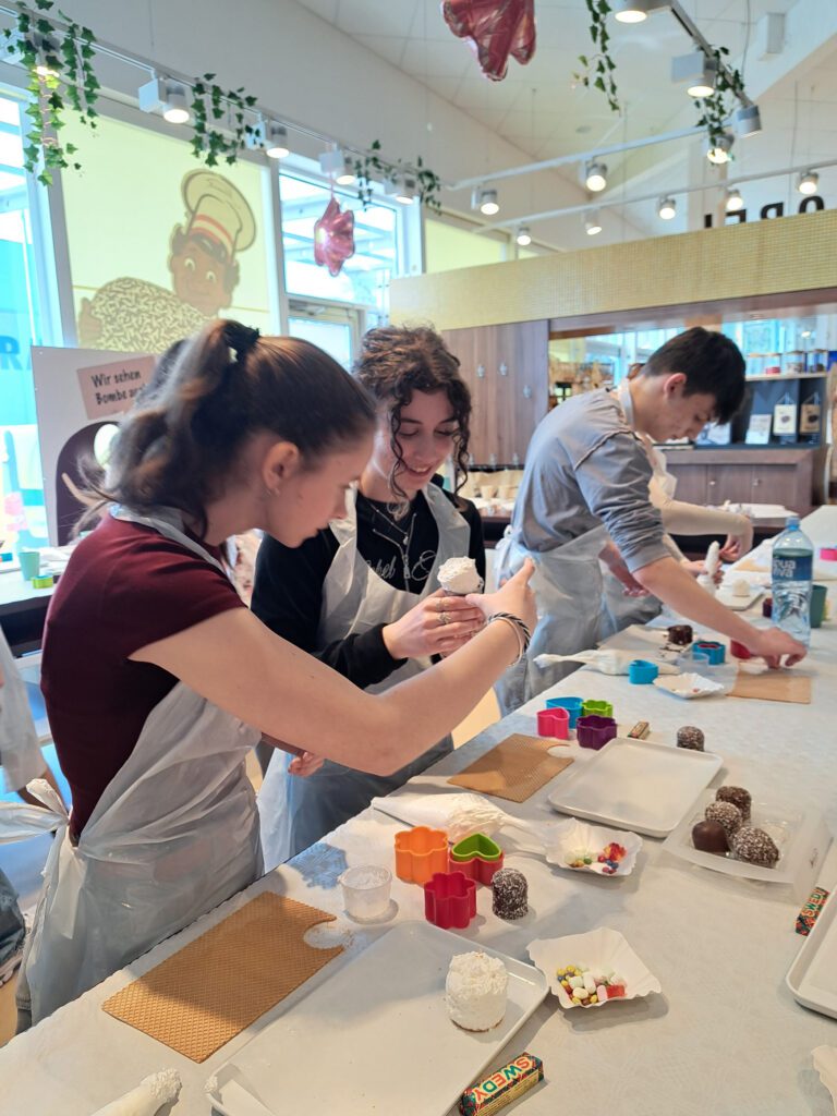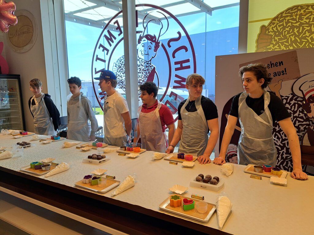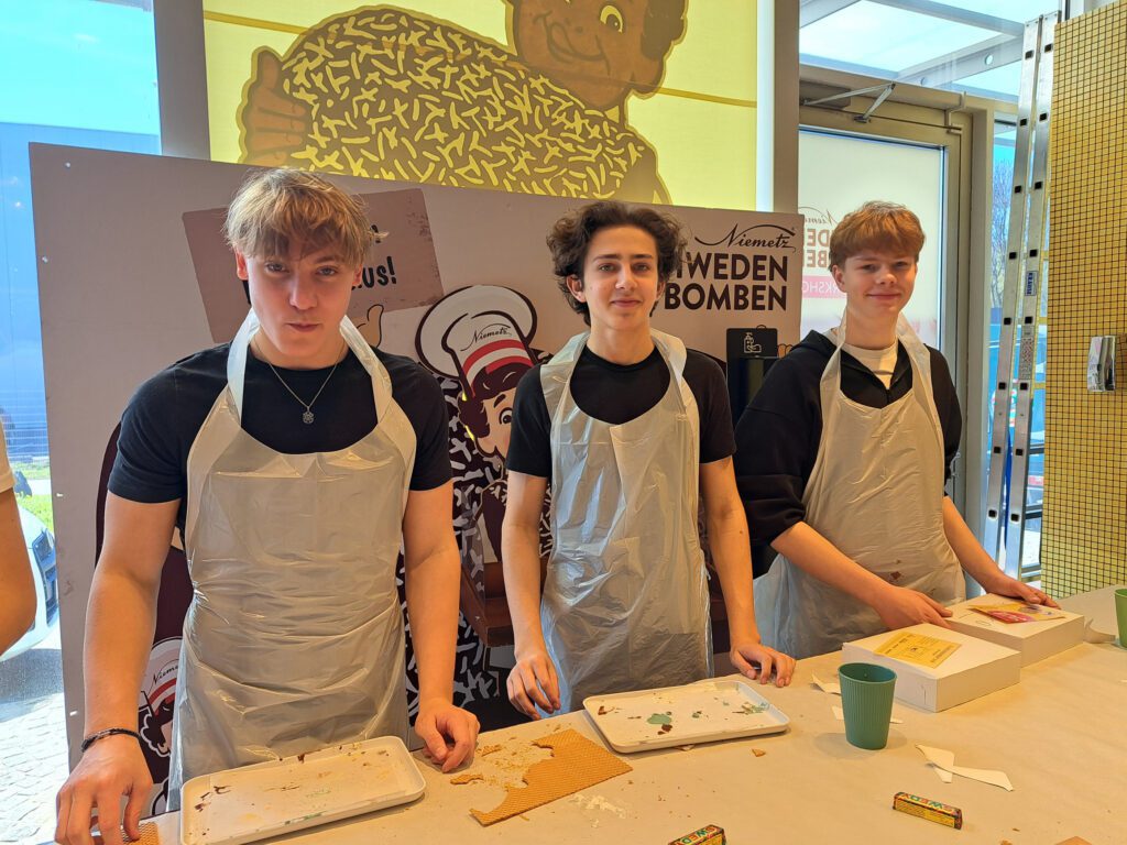 Im darauffolgenden Workshop stellten die Schüler*innen mit den bereitgestellten Materialien (Waffeln, Schaum und verschiedenste Schokoladeglasuren) ihre eigenen Schwedenbomben her. Der Besuch bei Niemetz war eine ansprechende Kombination aus Geschichte, Wirtschaft und Praxis.